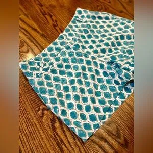 The Ann Taylor Loft Riviera Shorts in Teal and Cream Geometric Print are a stylish and versatile addition to any woman's wardrobe. These size 2 shorts feature a hook and eye closure, making them perfect for travel or casual occasions. Made from a linen and cotton blend, these shorts have a mid-rise and a flattering flat front design. With a 4-inch inseam and pockets, these chino-style shorts offer comfort and style for everyday wear.