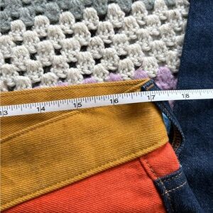 Bold jeans with vibrant orange and yellow waistband. Classic Calvin Klein style.