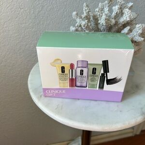 Clinique gift set includes pink lipstick, purple toner, and more. Ideal for a complete beauty routine.