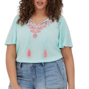 Torrid Embroidered Blouse - Crinkle Gauze Light Blue. Crinkle Gauze woven fabric: Lightweight, textured, breathable and still totally opaque. Stretch level: Minimum.V-neck. Embroidered. Tassels. No holes, stains, or piling.