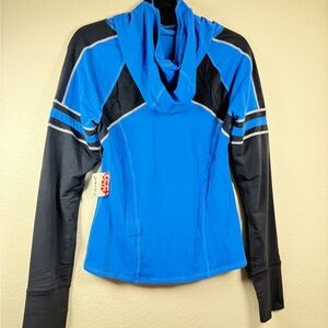 NWT Free People FP Movement Dawn To Dusk Solid Hoodie in Light Cobalt Combo, slim fit performance hoodie with contrast piecing, defined hood, contoured seaming, long sleeves with extended cuffs, stretchy athletic fabric great for skiing, layering, running, gym, athleisure. Condition: New With Tags. Size: Medium. Approx measurements (flat): chest 16.5 in, length 24 in. Retail: $118 Ships fast from Kourtney’s Kloset,