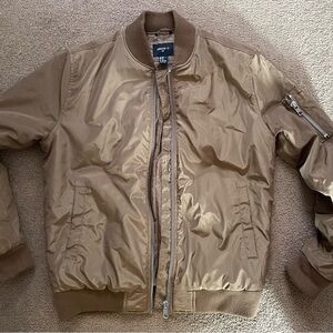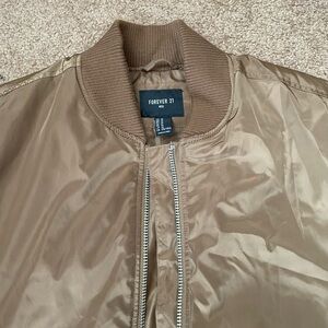 Forever 21 Men’s Brown/Tan Bomber Flight Jacket, worn only a few times, in excellent condition overall. 24 inches (pit to pit) and 27 inches in length. Please view all photos carefully, beautiful brown/tan colorway with a shine as shown in photos. Will be shipped with care and speed! :)