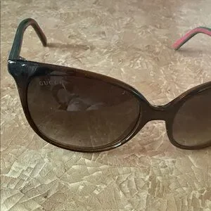 Stylish Gucci sunglasses with a sleek black frame and pink accents. Perfect for adding a touch of elegance to any outfit.