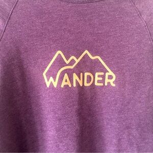 Super cute plum colored sweatshirt with “wander” printed on the front with containing mountain outline detail.