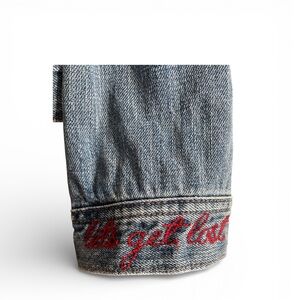 Features embroidery on sleeves “Lets get lost” and “Just for Fun” on back