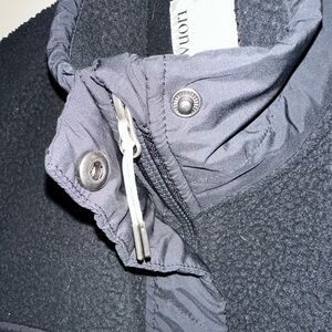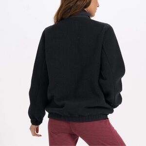 Vuori Utility Sherpa Jacket in Black. Cozy black Sherpa jacket with front cargo pockets. Ideal for layering and casual wear. Front zip closure with funnel neck. Elastic bottom hem. Cozy and warm! Good used condition. Size medium