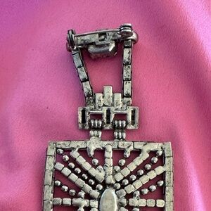 A striking Dylanlex statement brooch featuring an architectural shield design, crystal detailing, and dramatic fringe movement.
