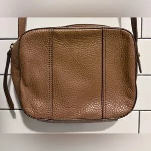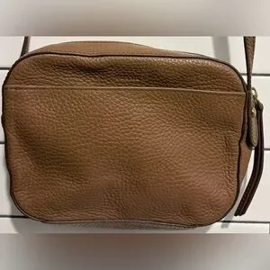 This stylish brown leather crossbody bag is perfect for any occasion. Its sleek design and durable material make it a must-have accessory. Gently used- a small blackish ink like stain on the interior lining fabric.