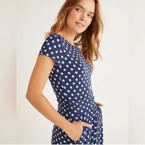 This is the quintessentially British Boden Amelie Jersey Dress in a timeless navy and white "Linear Brand Spot" pattern. It is crafted from a soft, drapey jersey fabric that resists wrinkles and offers a flattering silhouette with its signature waistband ruching.