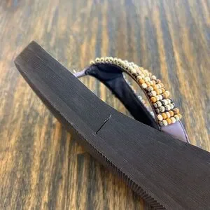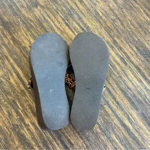 The cutest western-beachy style sandals from the early 2000s. Really cute wooden beading details. Perfect for vacations or spring break! There’s no size on them, but I’m usually a 6.5 and they’re a little too small on me. Please Use measurements! They have been soaked, scrubbed, and sanitized. They’re in great condition! Most of the wear is on the sole, and a small separation on the side of the shoe (see photos).