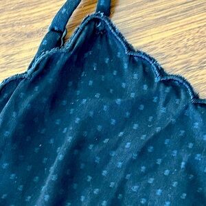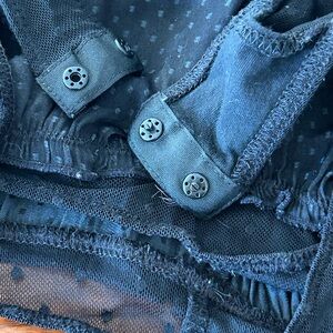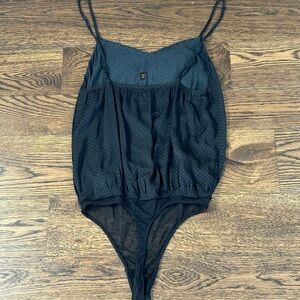 Chic and versatile loose fitting black bodysuit with a flattering V-neckline and tiny center cut outs. Adjustable straps. Fabric has a mini polka dot detail. Size S. Laying flat approximate measurements are 16" chest & 24" snapped length with stretch. Ideal for layering or wearing on its own. Good condition!