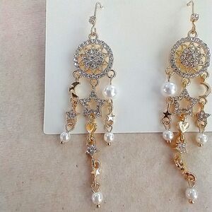 Dreamcatcher Earrings. Super cute, boho, modern, simple and minimalist design. Long earrings, measurements in pictures. Golden color with white faux pearls.