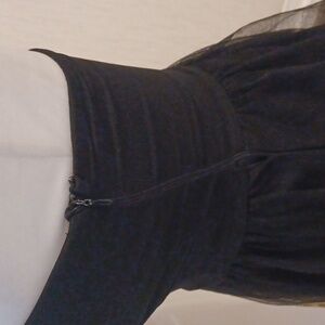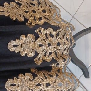 Stylish black dress with elegant gold accents, Windsor, size small (fits like XS) strapless with around the neck tie-up option, 3 skirt layers to make it puffy, side zipper, chest rubber grip, great condition.