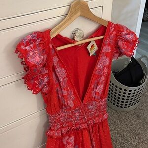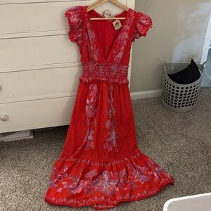 Step into elegance with the Red Olivia Lace Maxi Dress from FARM Rio. This enchanting piece features a vibrant floral pattern that dances across soft lace, creating a whimsical touch. The V neckline adds a playful charm, while delicate ruffled sleeves enhance its graceful silhouette. A smocked waist ensures a flattering fit, flowing beautifully into a tiered skirt that radiates warmth and sophistication with every step. Step into effortless elegance with the Olivia Red Maxi Dress from FARM Rio. This radiant dress captivates with its vibrant floral patterns and flattering V neckline. The whimsical ruffled sleeves add a playful touch, while the shirred waist accentuates your silhouette. Crafted with care, its flowy tiered skirt offers graceful movement, making it a dreamy choice for sunny days and enchanting evenings.