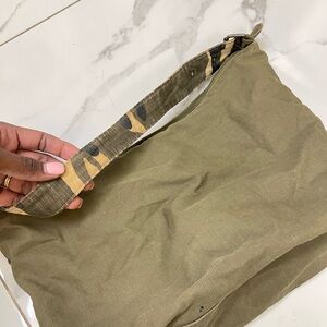 Stylish olive green shoulder bag featuring camouflage accents. Multiple front pockets for convenience.