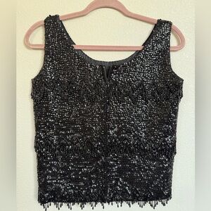 Stunning vintage black sequin top with intricate hand-beaded fringe detailing throughout. This piece is a true showstopper, featuring dense black sequins with layered beaded fringe bands that move beautifully and catch the light. The design gives strong 1920s / Art Deco / flapper-inspired vibes, perfect for evening wear, events, or styled modern with high-waisted pants or a skirt.