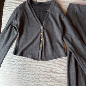 Stylish gray button cardigan paired with matching palazzo pants. Perfect for a chic look.