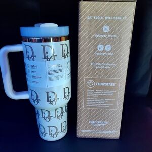 Stylish Stanley mug with bold logo design. Perfect for hot or cold drinks.