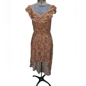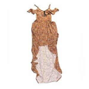 Charming off-shoulder dress by As U Wish. Features a vibrant floral pattern. High-low hem design. Perfect for casual outings.