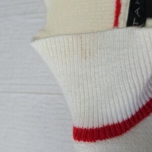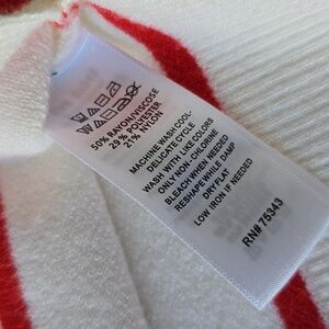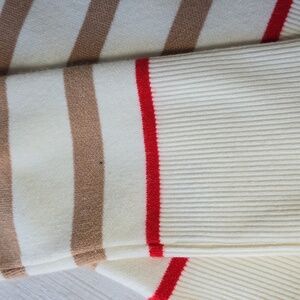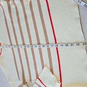 Features: Horizontal stripes, vibrant red accent trim, mock neck, side slits at hem, and elongated ribbed cuffs, 3/4 length sleeves