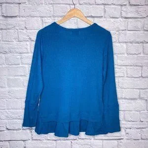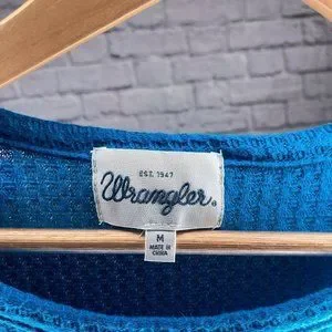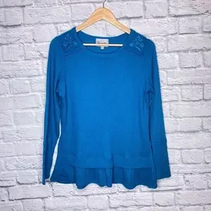 Wrangler Medium M Blue Waffle Thermal Knit Ruffle Floral Embroidered Top Shirt