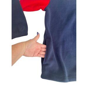 NFL Apparel Reebok men's blue and red New England Patriots pullover fleece jacket. Jacket has a white embroidered Patriots patch on the front and the red white and blue Patriots logo on the back. Jacket has a 1/4 zip front and two side pockets. It's made of 100% polyester and is a man's size XL.