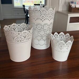 Charming white metal planters with delicate lace pattern. Ideal for adding elegance to any space. Use as planters, candle holders and more! An adorable little trio!
