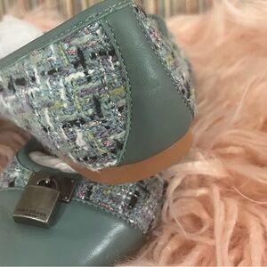 Elegant flats with a multicolor tweed design. Features a sleek metal accent. Ideal for versatile styling.