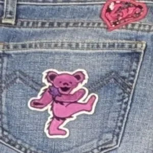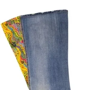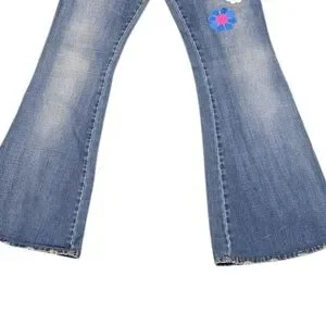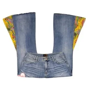 Statement Y2K Energie jeans featuring dramatic bell-bottom flares and bold psychedelic panel inserts. A true early-2000s club-to-festival silhouette with rigid denim structure and one-of-a-kind custom detailing. Designed to stand out—perfect for festival, jam band, and retro revival styling.