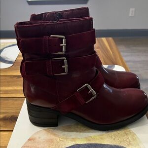 Miz Mooz Skye Ruby Red Moto Leather & Suede Boots. Zipper on sides. Excellent condition worn, size 40.