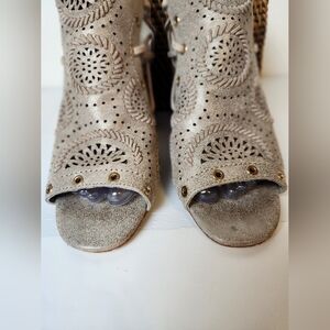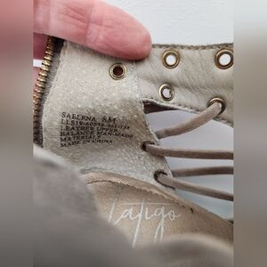 Latigo Leather Saelena Handcrafted Gold Grommet Zip Back Peep-Toe Block Heel