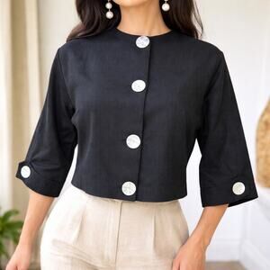 Striking vintage cropped jacket by Lee Mar of California, featuring oversized iridescent pearl-style buttons down the front and at the sleeve cuffs. This structured black jacket has a clean, minimalist silhouette with subtle mid-century flair—perfect layered over dresses, high-waisted trousers, or styled mod.