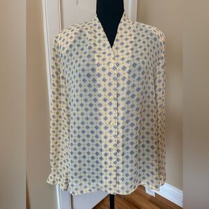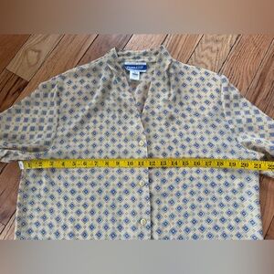 Vintage Pendleton Provence women’s yellow lightweight slightly sheer blouse with all over blue geometric print, size 10. New with tags, no flaws. Please see photos for item details/dimensions. Some photos may appear different in color due to lighting. Ships from smoke-free home.