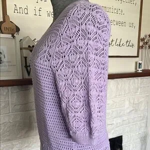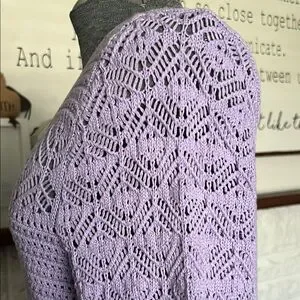 Elegant lavender sweater with detailed knit pattern. Perfect for layering.