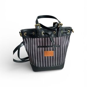 Stylish mini bucket bag with classic stripes. Durable handles and elegant design. Can be worn 3 ways: top handle, crossbody or as mini backpack.