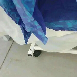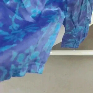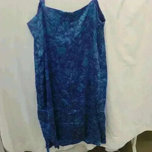 lighter blue and vivid blue dress there are no size tags on this or any tag showing me the material It feels like some type of silk / polyester zips up in the back with a clasp the length from the top of the shoulder down to the hemline is 41 in The waist is box my 34 in super soft