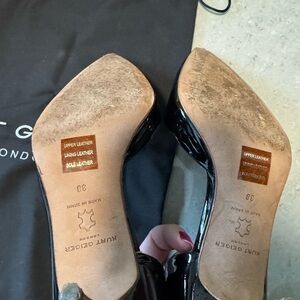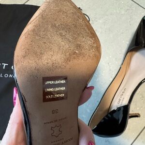 Chic black patent leather heels. Sleek design with a pointed toe. Ideal for elegant occasions.