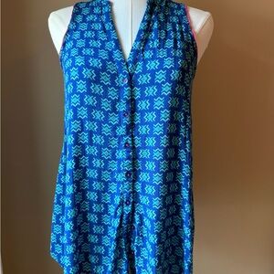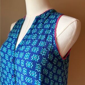 This Maeve top features a vibrant blue hue and a relaxed button-down style, complete with a mandarin collar for a modern touch. The lightweight fabric ensures a comfortable fit, while the buttoned design adds a classic element to this versatile piece.