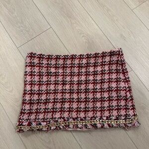 Elegant tweed mini skirt with red and pink hues. Features fringe accents and gold chain detail.