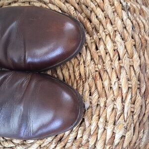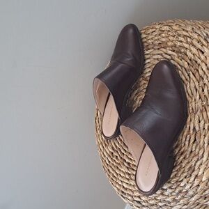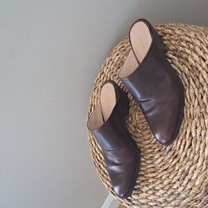 Trending preppy brand G.H. Bass & Co. women's chocolate brown leather mules with 2" wood block heels and rounded toes. Pre-owned and in very gently used condition. Please see pictures.