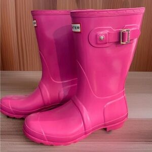 Iconic Hunter Original Gloss Short rain boots in a vibrant pink/fuchsia shade. Classic waterproof rubber construction with signature side buckle detail and durable treaded sole. Perfect for rainy days, festivals, gardening, or everyday wear with style.