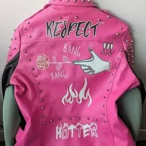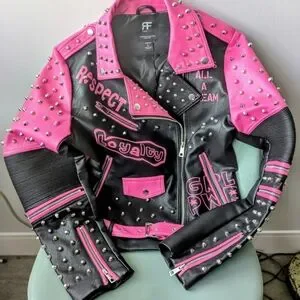 Bold pink and black moto jacket with studded details. Features graphic text and zipper accents.