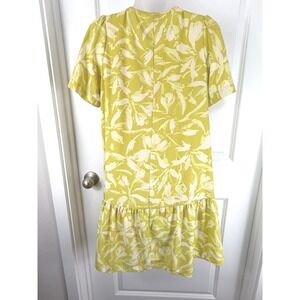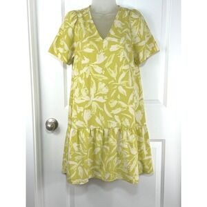 A New Day women's lime green dress featuring a white leaf print. This tiered dress has a V-neckline and short sleeves with a slight puff. The skirt portion is tiered with a ruffled hemline.