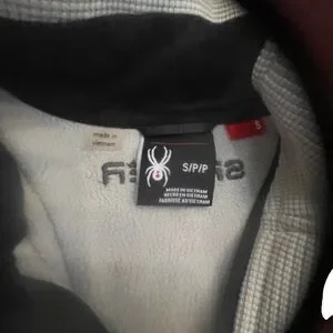 Cozy Spyder jacket with a soft fleece interior. Features a black and white design. Ideal for warmth and comfort.