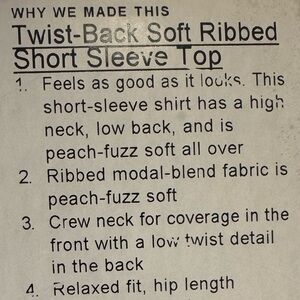 • Crew neck for coverage in the front with a low twist detail in the back