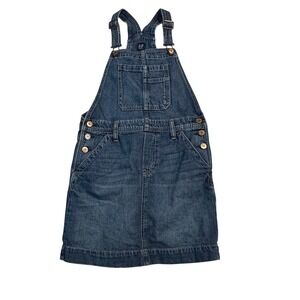 Gap denim overalls dress in a classic blue wash. This versatile piece features adjustable shoulder straps, a bib front with a pocket, button closures at the hips, and a skirt silhouette. Two back pockets offer practical storage.