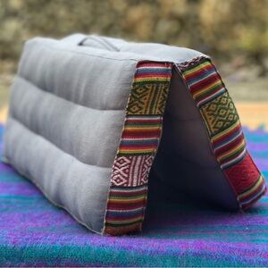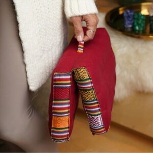 Foldable and easy to carry sewn hand strap, this pillow works as a floor cushion, portable bolster, or yoga block.