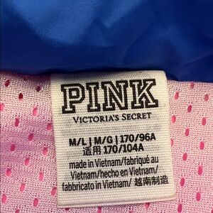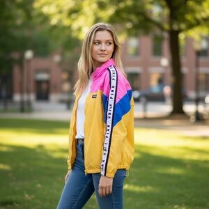 Vibrant PINK (Victoria’s Secret) retro style hooded windbreaker jacket with bold pink, yellow, and blue colors. Features branded stripe details along the sleeves. Stylish and functional.