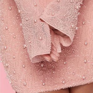 Elegant pink dress with intricate bead detailing. Features a deep neckline and long sleeves. Perfect for special occasions.