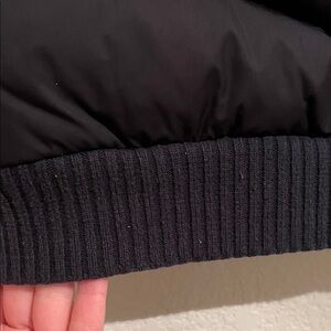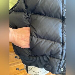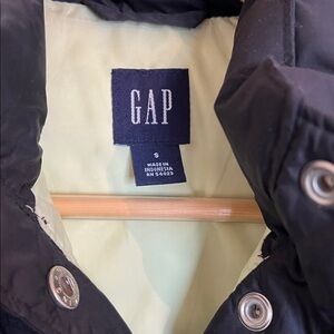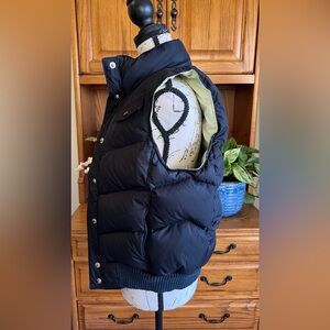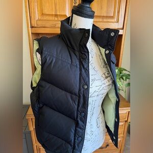 Vintage black puffer vest by GAP. Down filled, very warm and fluffy. Has pockets and buttons up the front. No zipper. There is some wear in the button as shown in photos. Excellent condition! Light green interior.